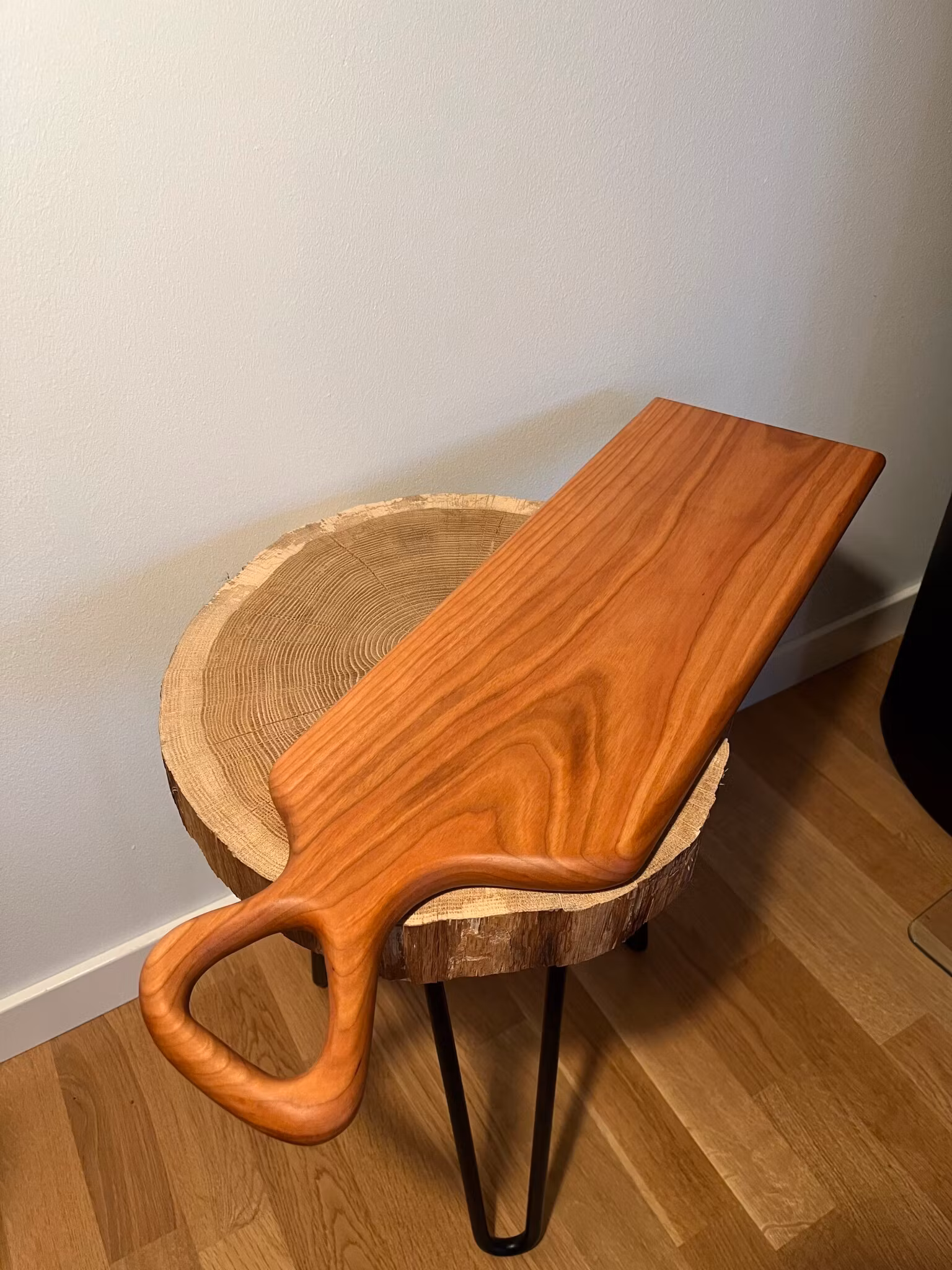 Handgjord skärbräda i körsbär med naturlig ådring. Passar bra både som skärbräda och serveringsbricka. Varje skärbräda behandlas med paraffinolja och skärbrädevax för att skydda träet och framhäva den naturliga ådringen.