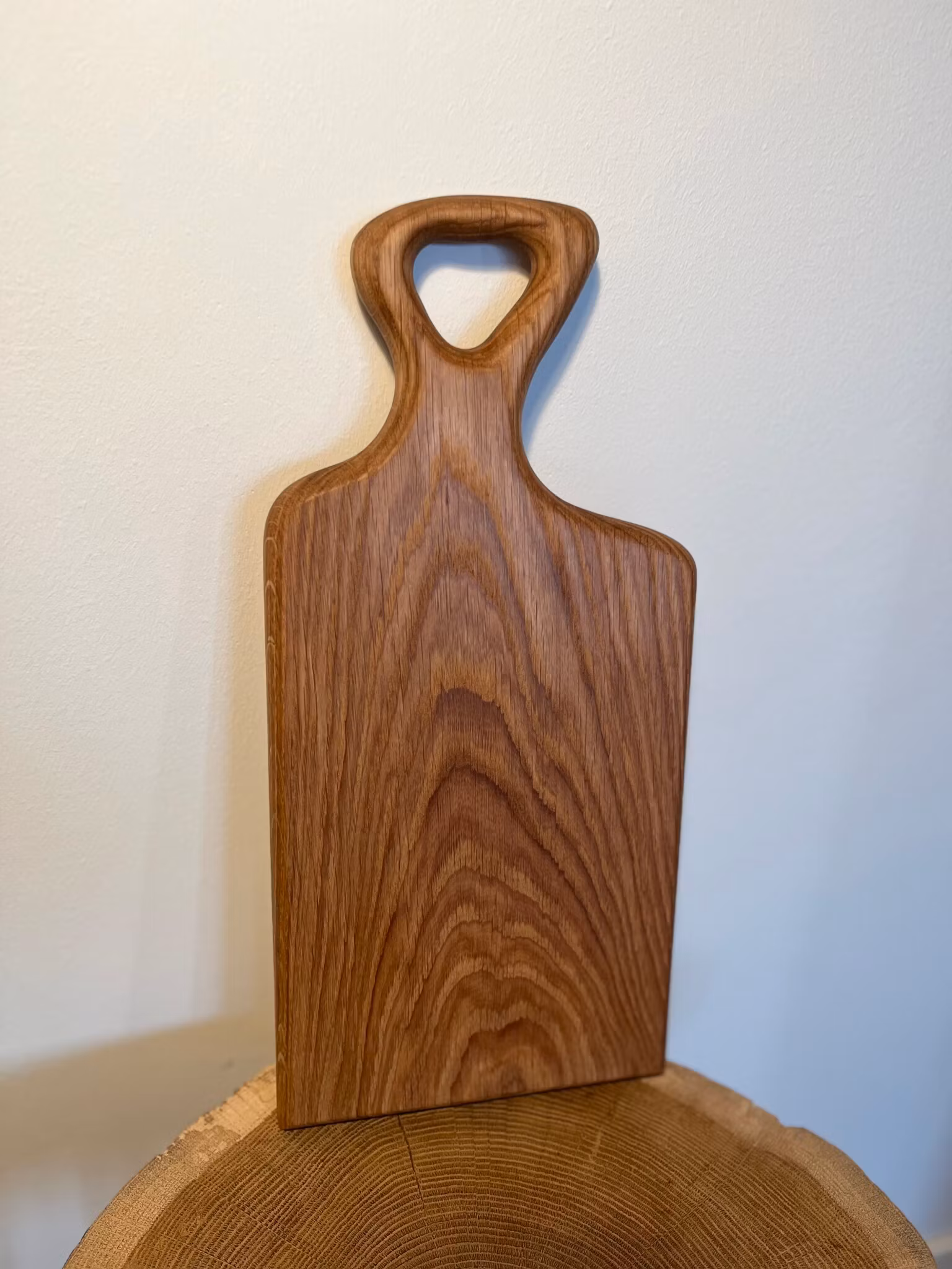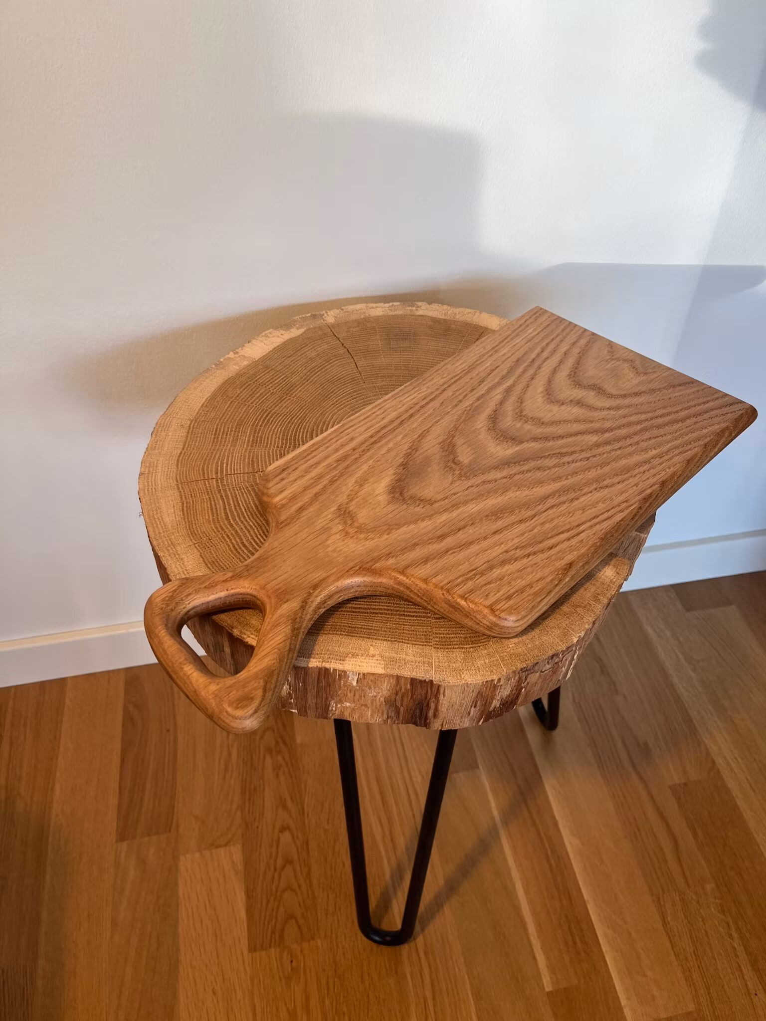 Handgjord skärbräda i massiv ek med naturlig ådring. Passar bra både som skärbräda och serveringsbricka. Varje skärbräda behandlas med paraffinolja och skärbrädevax för att skydda träet och framhäva den naturliga ådringen.