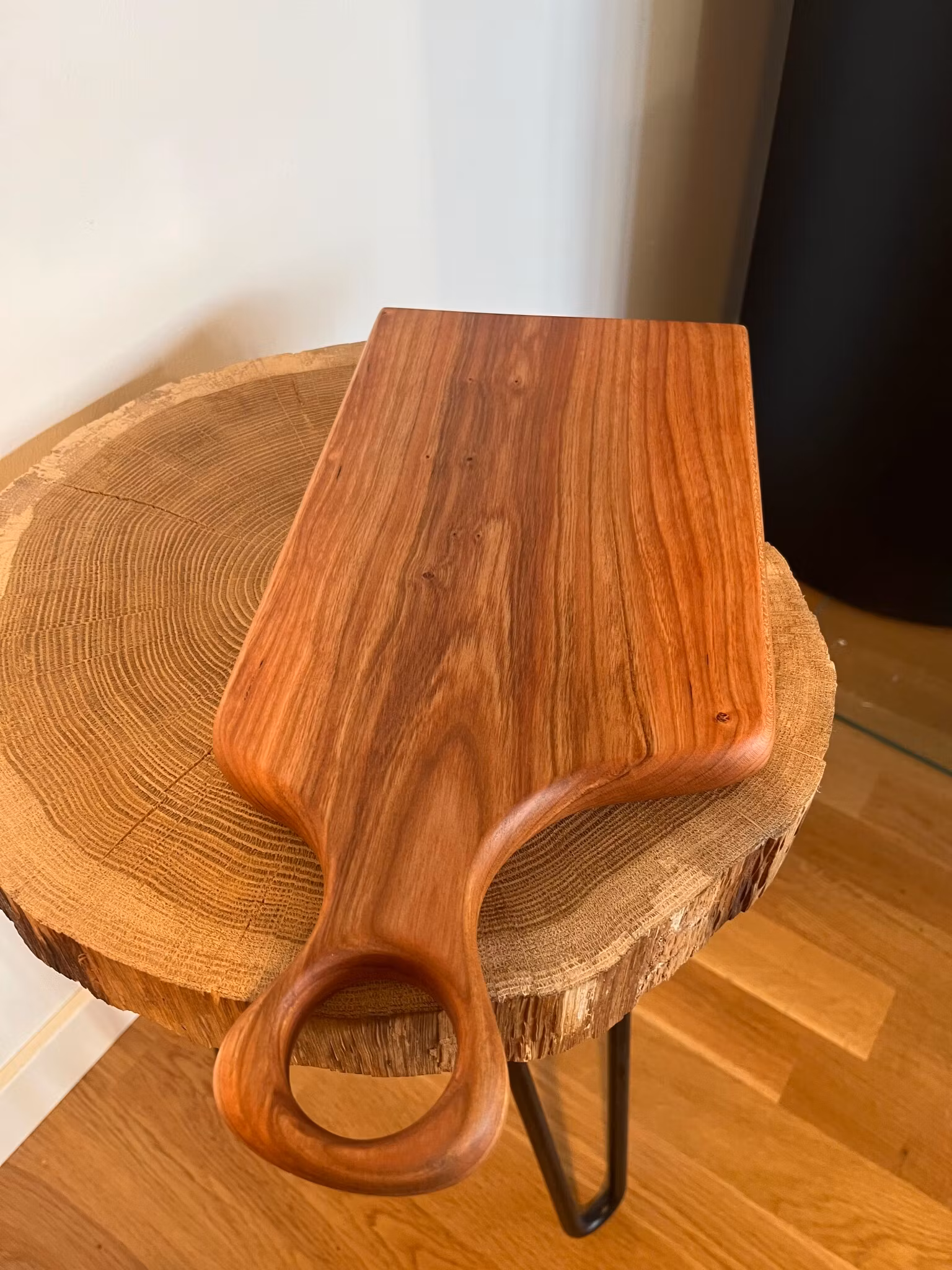 Handgjord skärbräda i körsbär med naturlig ådring. Passar bra både som skärbräda och serveringsbricka. Varje skärbräda behandlas med paraffinolja och skärbrädevax för att skydda träet och framhäva den naturliga ådringen.